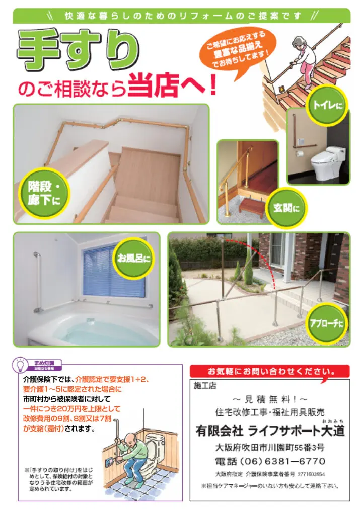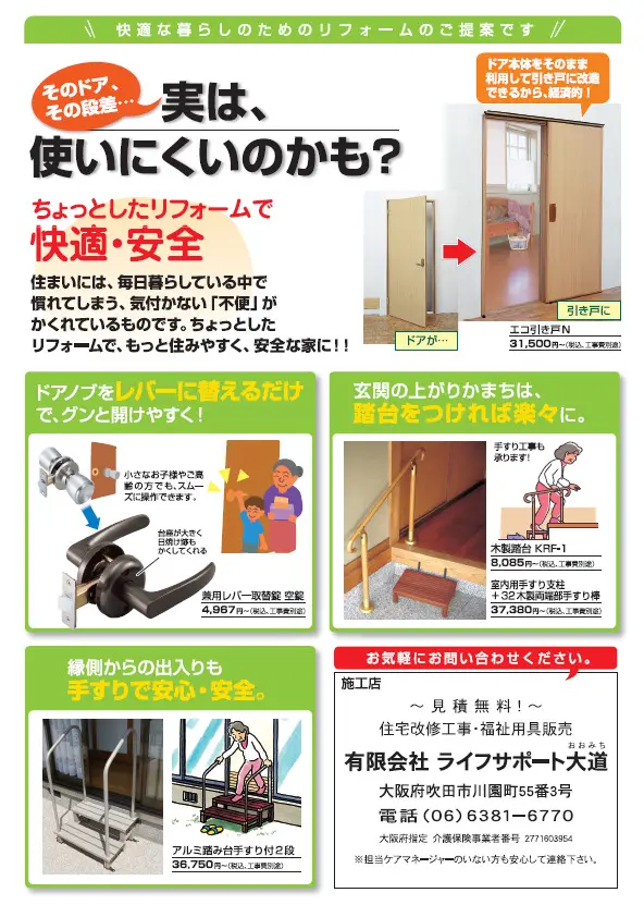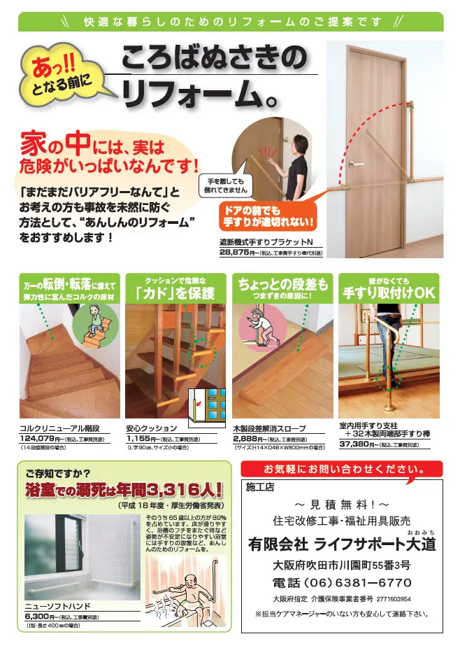 なお、要介護認定を受けてはいるがケアマネージャーのおられない場合でも、住宅改修工事に必要な「理由書」の作成も当社で承っておりますので、安心してご相談ください。
